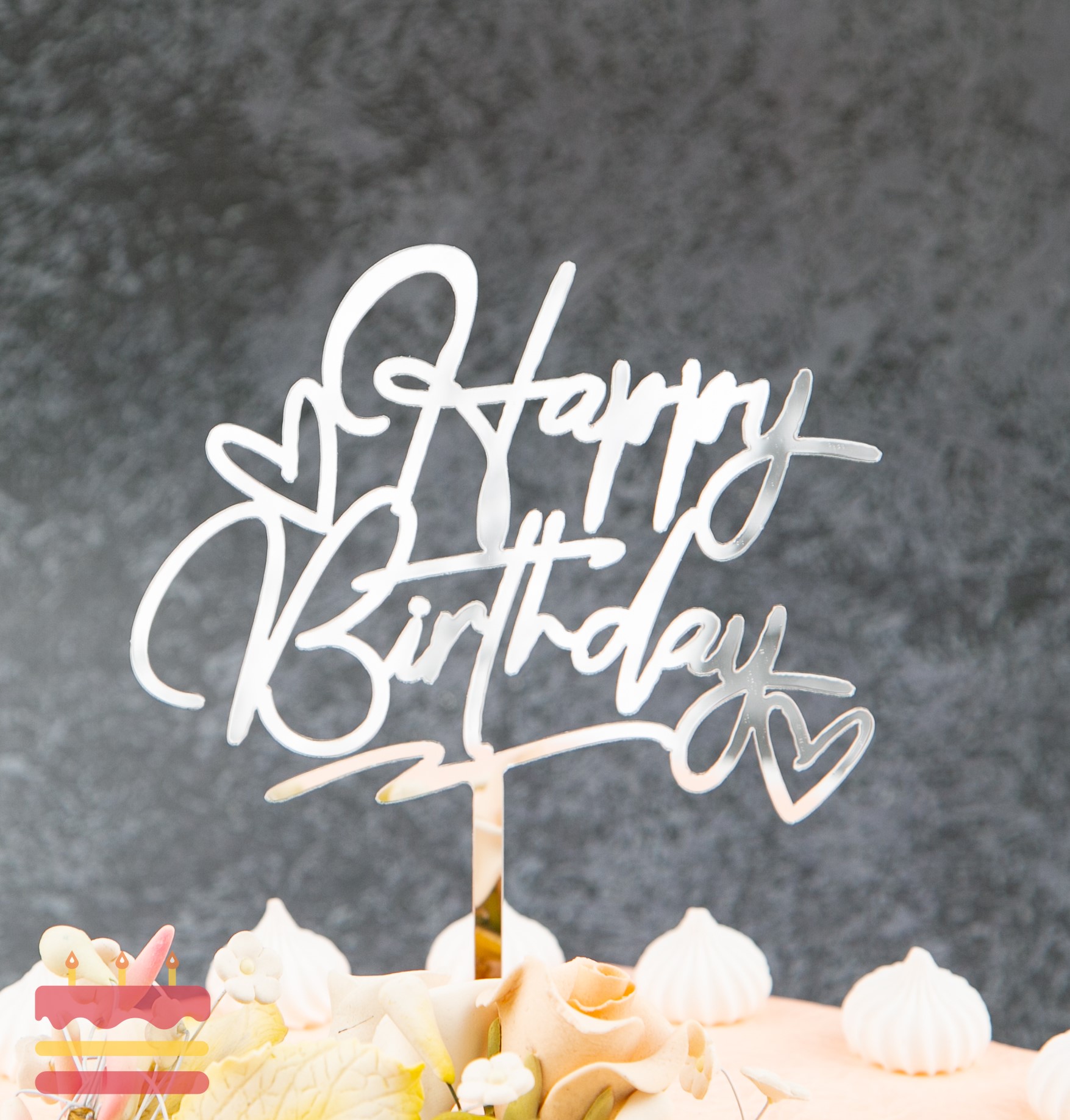 Топпер акриловый Happy Birthday (с сердцем) серебро 2