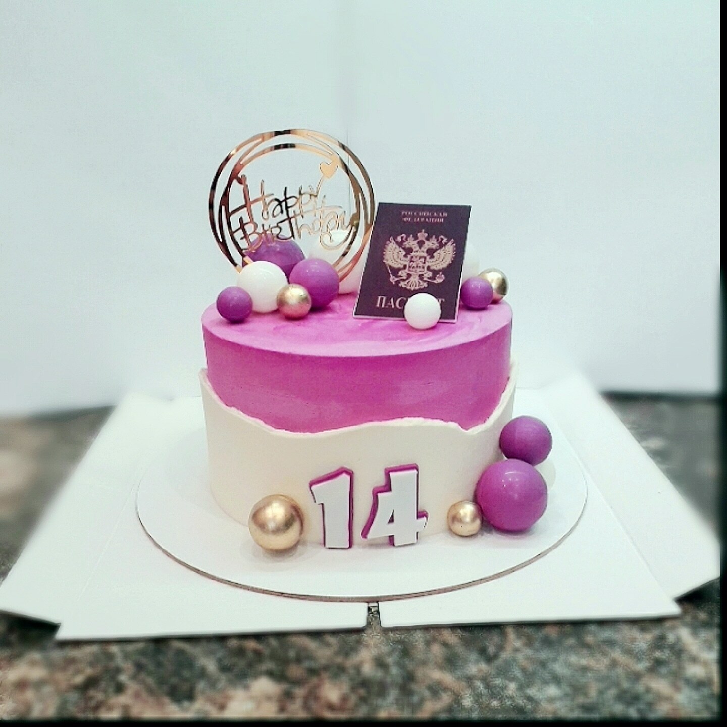 Топпер на торт на ножке “Happy Birthday” Сердечки Круг Золото