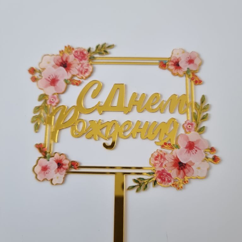 Топпер на ножке Квадрат «С Днем Рождения» Золото Розовый букет