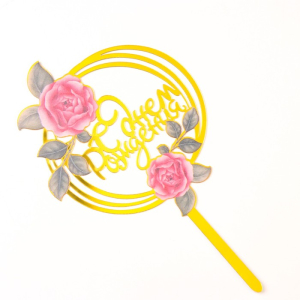 Топпер для торта «С днём рождения» Цветы Розы Золото